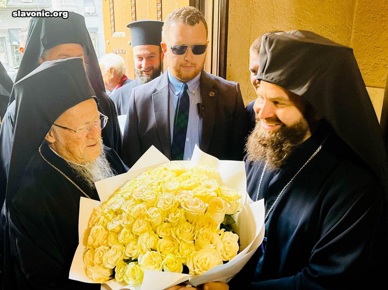 Before the meeting began, the Vicar of the Slavic Vicariate, Archimandrite Alexander (Belya), Bishop-elect of Niсopolis, greeted His All-Holiness Patriarch Bartholomew and presented him with a bouquet of white roses.
