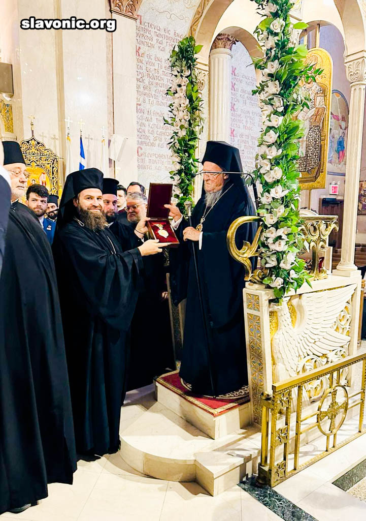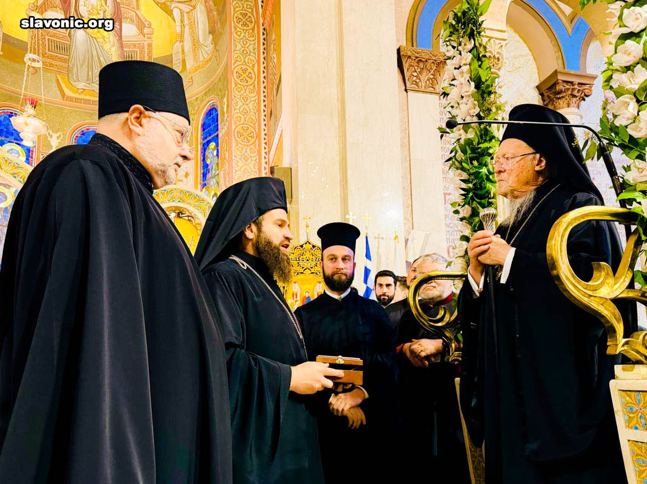 Archimandrite Alexander, on behalf of the clergy, monastics, and laity of the Slavic Vicariate, presented His All-Holiness with a panagia bearing the image of the Christ Savior, thanking him for his support and prayers.